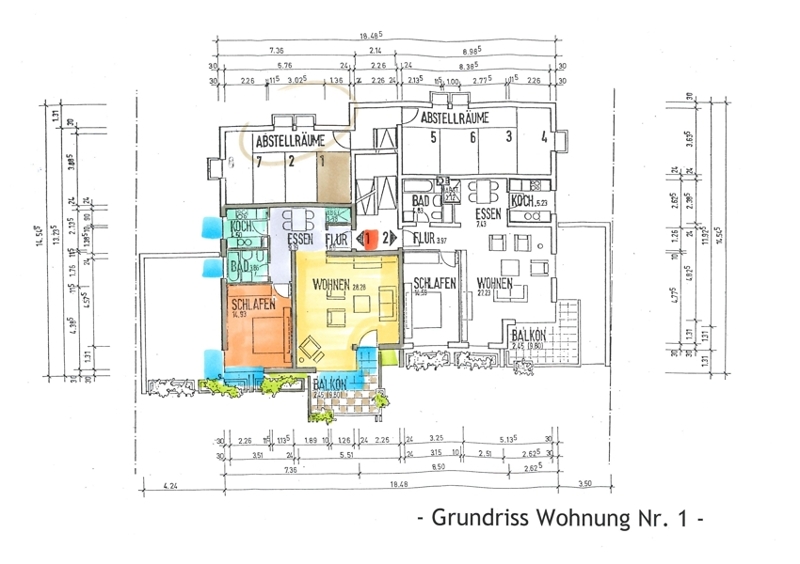 Der Wohnungsgrundriss sieht folgendermaßen aus: Wohnungseingang, kleiner Flur, Essbereich und links davon ein mit beinahe 30 m² sehr großer, offener Wohnbereich. Von hier aus betreten wir den Balkon. Trotz der Nord-West-Ausrichtung können Sie hier viele Sonnenstunden genießen, da der Balkon dem Wohnhaus vorgebaut wurde. Außerdem verläuft er über Eck, was für zusätzliche Offenheit sorgt. Die große Fensterfront, ebenfalls über Eck, bringt zudem viel Licht in den Raum.