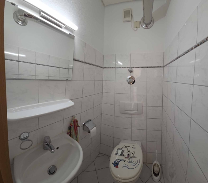 Alle Böden in der Wohnung, bis auf das Gäste-WC und das neu erstellte Badezimmer, sind einheitlich mit Laminat belegt. Das WC ist mit weißen, leicht marmorierten Fliesen ausgestattet.