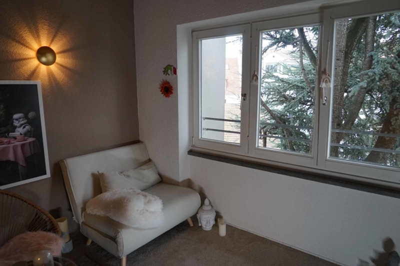 Das Wohnzimmer zur Straße hin ist mit drei großen Fenstertürelementen ausgestattet, davor jeweils ein französischer Balkon. Die großen Fensterelemente machen den Raum zu jeder Tageszeit hell und freundlich.