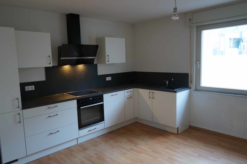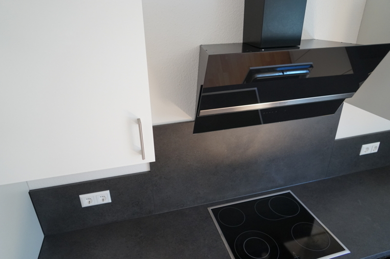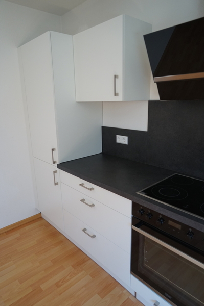 In der Küche befindet sich eine neue und moderne, in Schwarz und Weiß gehaltene Einbauküche mit hochwertigen Geräten. Mit ihren 17 m² Wohnfläche bietet sie ausreichend Platz für einen Essbereich für mind. 4 Personen.
