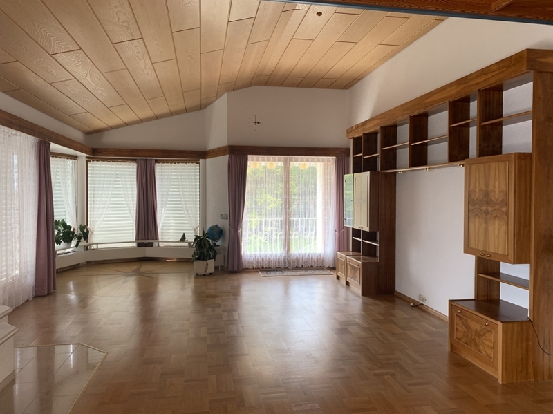 In den Wohnräumen liegt Originalparkettboden. In Schlaf- und Gästezimmer finden wir Vinylboden vor. Die Bäder sind gefliest, so auch die Küche und der Vorratsraum.