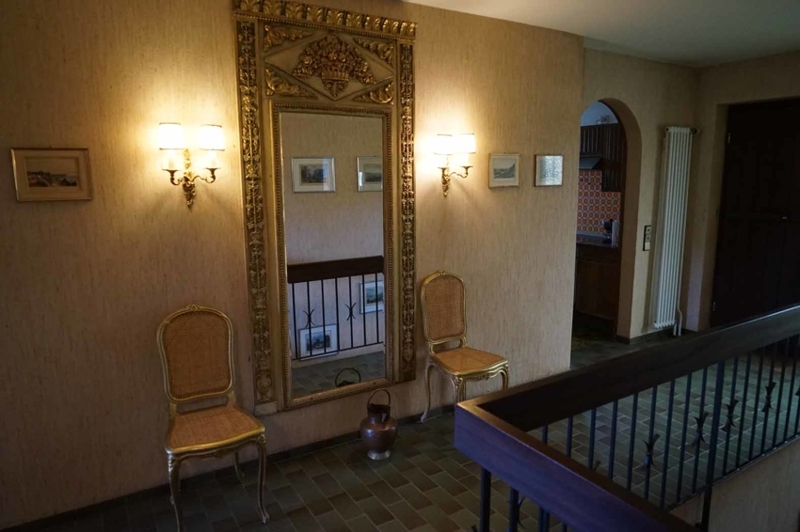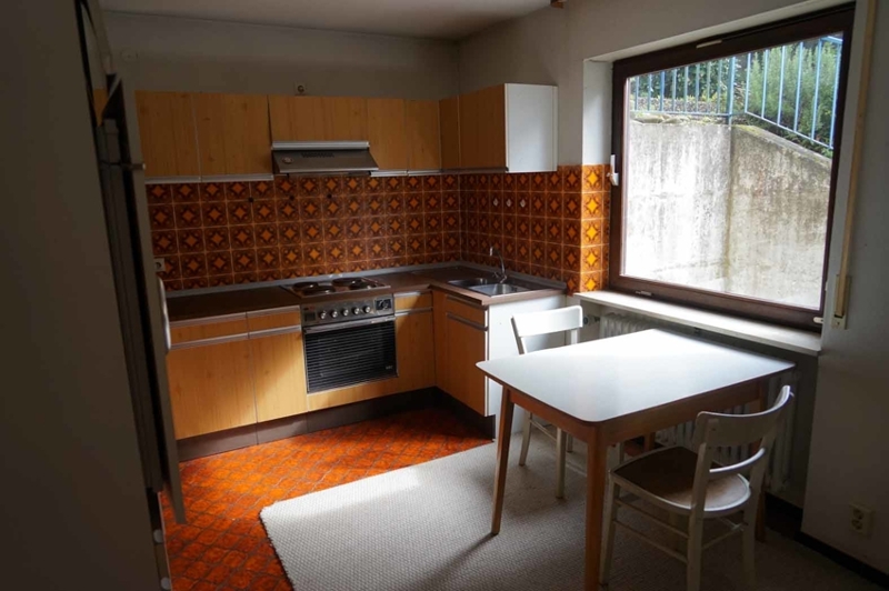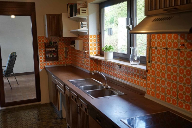 Die Böden im Haus sind zum großen Teil mit Fliesen oder Laminat belegt, hier und da haben wir einen Kork- oder auch Teppichboden in den Schlafräumen. Badezimmer und Gästetoiletten sind ebenfalls aus dem Baujahr. Die Wände sind überwiegend mit Gewebetapeten oder Raufaser ausgestattet. Die Zimmerdecken im Essbereich und die Unteransicht der Balkonterrassendecken sind mit Holz verschalt. Im Wohnzimmer befindet sich ein großer offener Kamin. Beide Wohnungen sind mit Einbauküchen ausgestattet.
