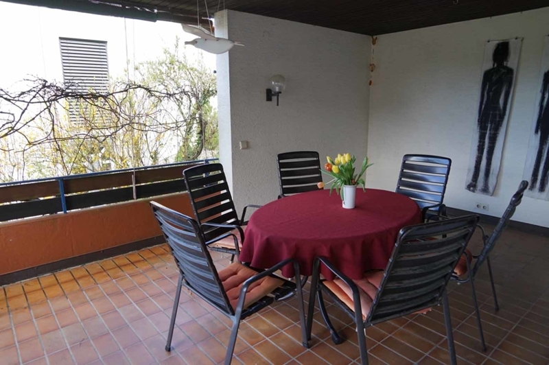 Die Gartenwohnung verfügt über eine nach Süden ausgerichtete breite Terrassenfläche, die Wohnung darüber über einen großen von Süd nach West umlaufenden Balkon. Durch die Balkonfläche wird die darunterliegende Terrasse gänzlich überdeckt. Jedoch ist auch der südliche Balkonabschnitt durch einen tiefen Dachüberstand vor Wetter geschützt. Der Balkon hat eine Grundfläche von ca. 45 m² und ist in der oben angegebenen Wohnfläche lediglich mit 11 m² (einem Viertel) ausgewiesen.