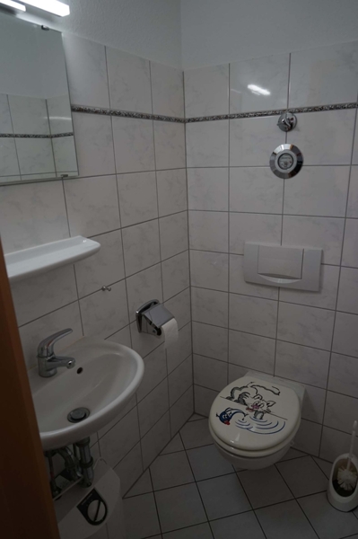 Alle Böden in der Wohnung, bis auf das Gäste-WC und das neu erstellte Badezimmer, sind einheitlich mit Laminat belegt. Das WC ist mit weißen, leicht marmorierten Fliesen ausgestattet.