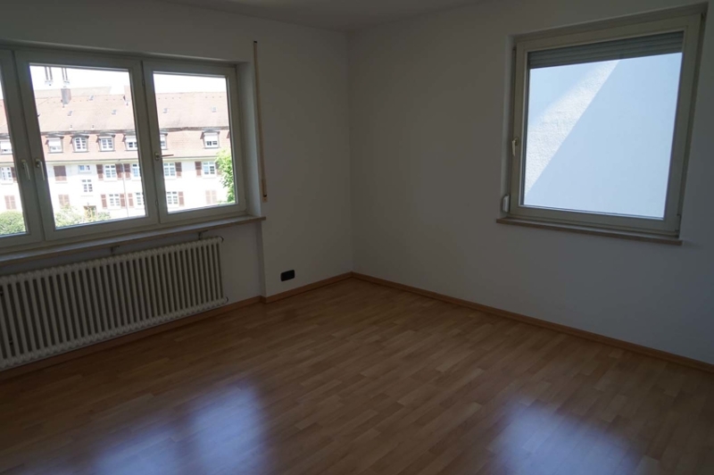 Das Wohnzimmer zur Straße hin ist mit drei großen Fenstertürelementen ausgestattet, davor jeweils ein französischer Balkon. Die großen Fensterelemente machen den Raum zu jeder Tageszeit hell und freundlich.
