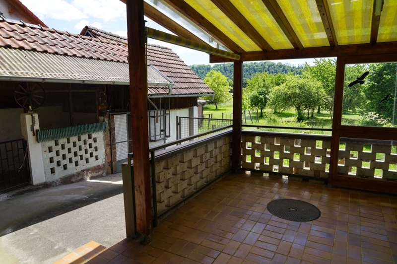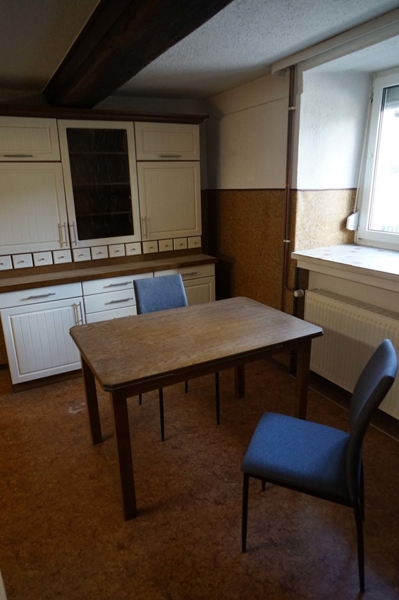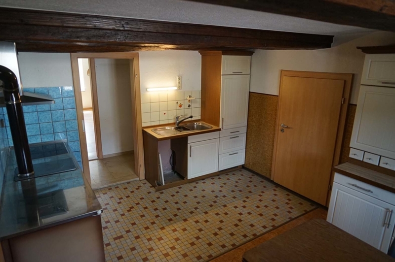 Die in die Jahre gekommene zusammengestellte Einbauküche hat rustikalen Charakter. Dieser wird durch die gepflegt herausgearbeiteten Holzbalken an der Decke verstärkt. Eine anschließende überdachte, großzügige Terrasse lädt zum Verweilen an Sommertagen ein.