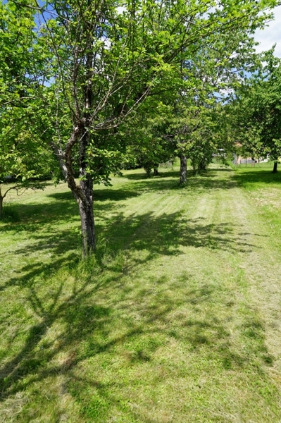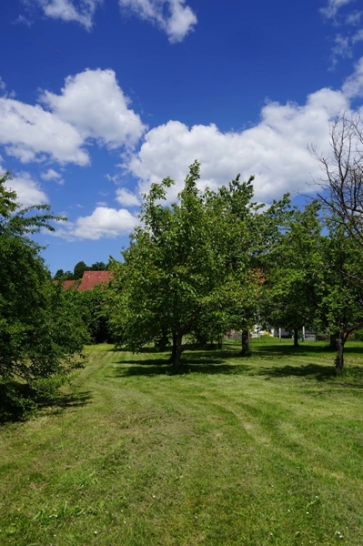 Wie bereits zu Beginn erwähnt, liegt unser charmantes Bauernhaus sehr zentral und doch in wunderbar ruhiger Lage. Grund dafür ist das sich hinter dem Wohnhaus nach Süden erstreckende, großzügige Wiesengrundstück mit seinen 1.317 m². Eine riesige Blumenwiese mit vielen Obstbäumen, ideal zum Entspannen, Gärtnern und natürlich ein Paradies für Kinder. Die Ausrichtung nach Süden sorgt für optimale Lichtverhältnisse im gesamten Haus und Sonne pur auf den beiden Gartenterrassen.
