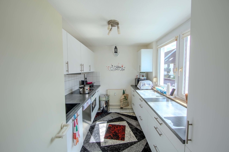 Die moderne Einbauküche aus dem Jahr 2022 präsentiert sich in zeitlosem Weiß mit einer grauen Arbeitsplatte. Zwei gegenüberliegende Küchenzeilen bieten überdurchschnittlich viel Stauraum sowie großzügige Arbeitsflächen – ideal für Kochbegeisterte.