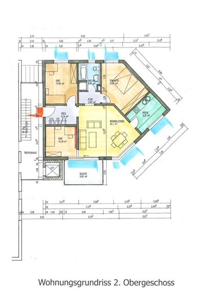 Ergänzend zum bestehenden Grundriss ist anzumerken, dass das zweite Kinderzimmer aktuell über das Wohn- und Esszimmer erreichbar ist und somit als gefangenes Zimmer gilt. Die Trennung zum Wohnbereich erfolgt über ein eingebautes Schiebetürelement. Eine direkte Erschließung über den Flur wäre mit geringem Aufwand realisierbar.