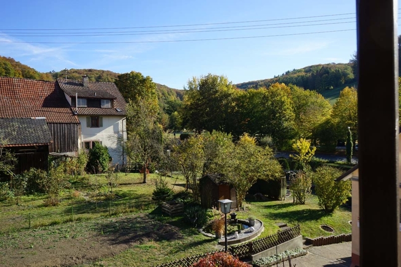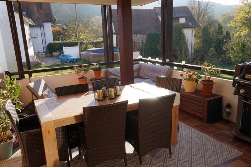 Von hier aus führt der direkte Zugang auf den großen, quadratisch geschnittenen Südbalkon (ca. 15 m²). Der Balkon ist komplett überdacht und bietet einen wunderbaren Blick auf die Wiesen und Wälder rund um das Inzlinger Wasserschloss – ein Ort zum Entspannen und Genießen zu jeder Jahreszeit.