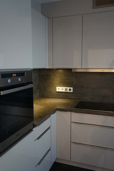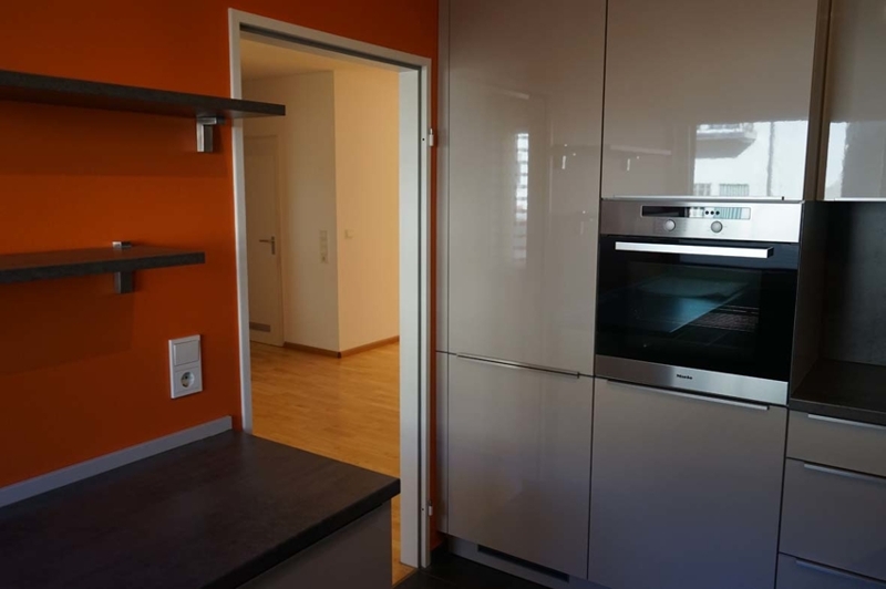 Im Zuge der Renovation wurde unter anderem eine hochwertige Miele-Einbauküche installiert, ausgestattet mit lichtgrauen Lackfronten, dunkler Arbeitsplatte, Backofen auf Arbeitshöhe, überbreitem Induktionskochherd, Geschirrspüler, großem Kühlschrank und separatem Gefrierschrank. In der Rückwandverkleidung ist dezent ein über Tasten steuerbares Radio integriert.