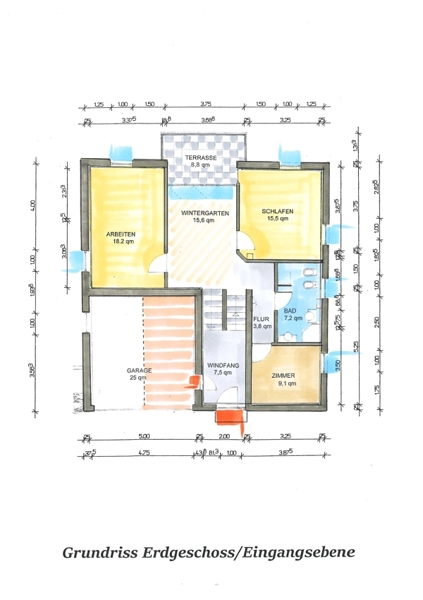 Ursprünglich war das Wohnhaus als Einfamilienhaus konzipiert mit einem durchgängigen Treppenhaus. Bei der späteren tatsächlichen Bauausführung wurden dann zwei baurechtlich ab- geschlossene Wohnungen errichtet. Dabei wurde das bestehende Treppenhaus baulich verändert, um die Abgeschlossenheit der beiden Wohnungen zu gewährleisten.