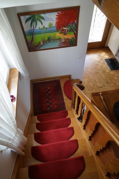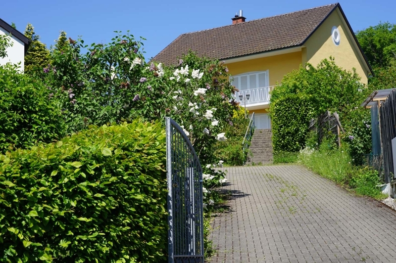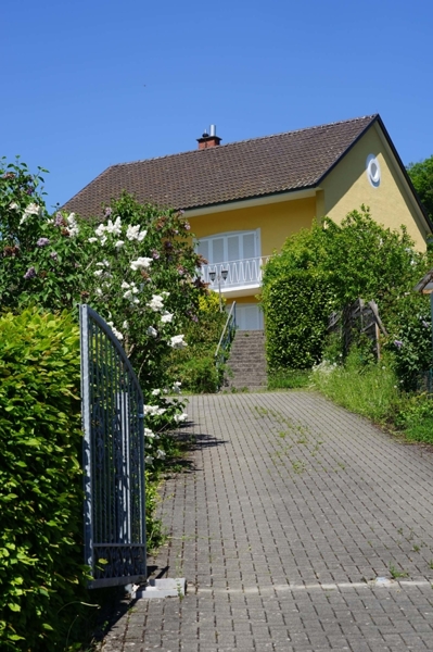 Mit dem PKW kann man die lange eigene Auffahrt zum Wohnhaus befahren bis zu einem an der oberen Grundstücksgrenze liegenden Treppenaufgang. Dort kann der PKW auch geparkt werden.
