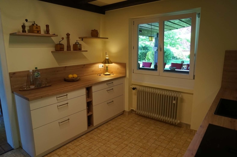 - Landhausküche mit Tisch u. Sitzgelegenheit