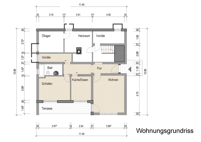 Unsere 2-Zimmer-Wohnung befindet sich im Untergeschoss eines Zweifamilienhauses. Man gelangt zur Eingangstür über einen separaten Eingang, der linker Hand am Haus entlang verläuft. Aufgrund der zum Hauseingang ansteigenden Hanglage, betritt man die Wohnung ebenerdig und hat somit eher das Befinden, im Erdgeschoss zu wohnen.