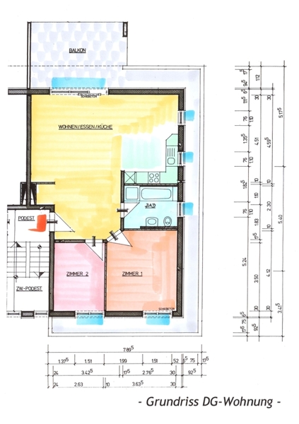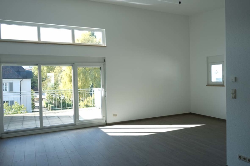 Der Südwest ausgerichtete Wohn- und Essbereich ist mit seinen knapp 40 m² sehr großzügig geschnitten. Durch seine Lage ist er den ganzen Tag über sonnendurchflutet. Am höchsten Punkt haben wir hier eine Deckenhöhe von 3,85 m (Pultdach), was den Raum noch majestätischer wirken lässt. Eine wunderbare Ergänzung zum Wohnraum stellt der hier anschließende, ca. 17 m² große Balkon dar. Dieser kann durch seine beinahe quadratische Bodenfläche optimal genutzt werden.