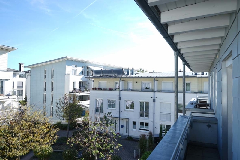 Vom Balkon aus führt ein schmaler Umlauf außen um die komplette Wohnung herum. Balkon und Balkonumlauf haben eine Grundfläche von ca. 40 m². Diese ist mit 25% (ca. 10 m²) in der vorstehenden Wohnfläche enthalten.