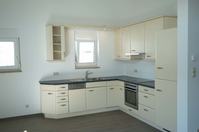 Der Wohnbereich ist zur Diele hin offen und beherbergt gleich beim Wohnungseingang eine Gardarobenecke. Die Vorrichtungen für eine Einbauküche in L-Form befinden sich rechter Hand.