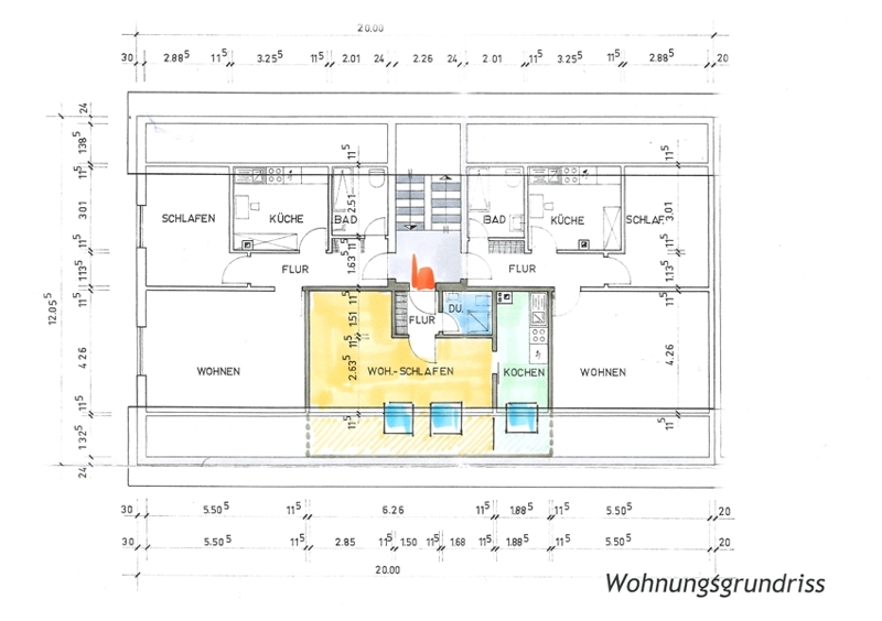 Die gesamte Wohnung hat eine Bodenfläche von ca. 35 m². Durch den Abzug der Schrägen erhalten wir somit eine Wohnfläche von ca. 28 m².