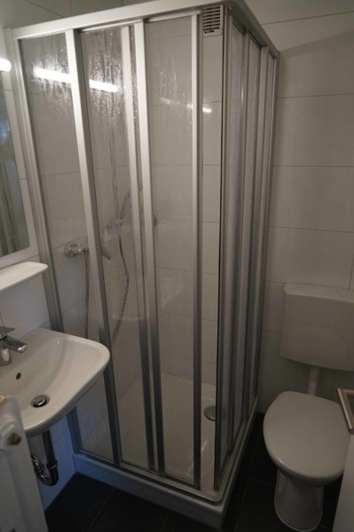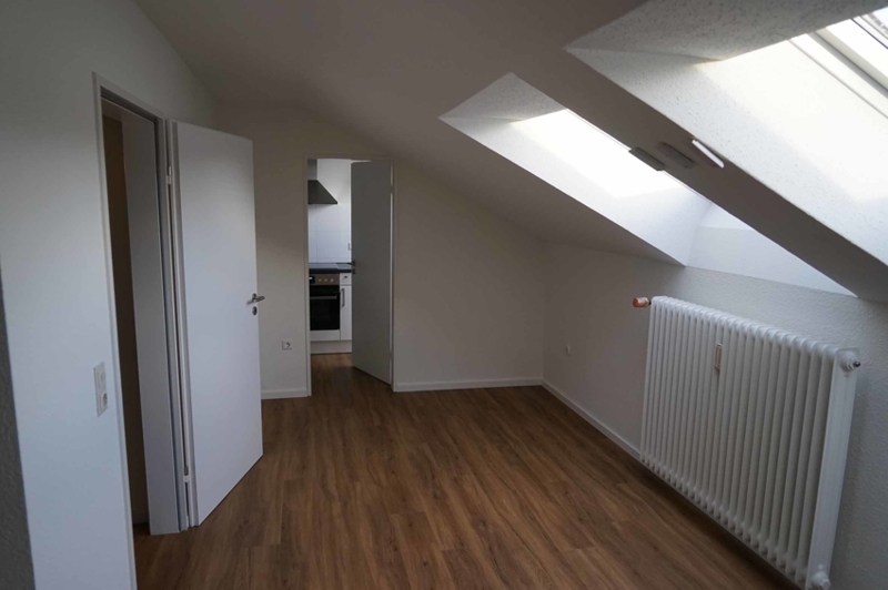 Der Wohn/Schlafbereich ist durch die L-Form mit seinen ca. 17 m² gut in Schlafzimmer und Wohnzimmer teilbar. Die Küche ist recht geräumig. Zusätzlicher Stauraum bietet der Platz unter der Dachschräge, welcher durch eine eingebaute Tür nutzbar gemacht wurde. Das innenliegende Badezimmer mit Dusche befindet sich gleich im Flur linker Hand.