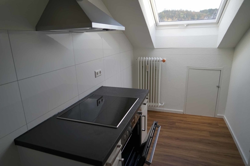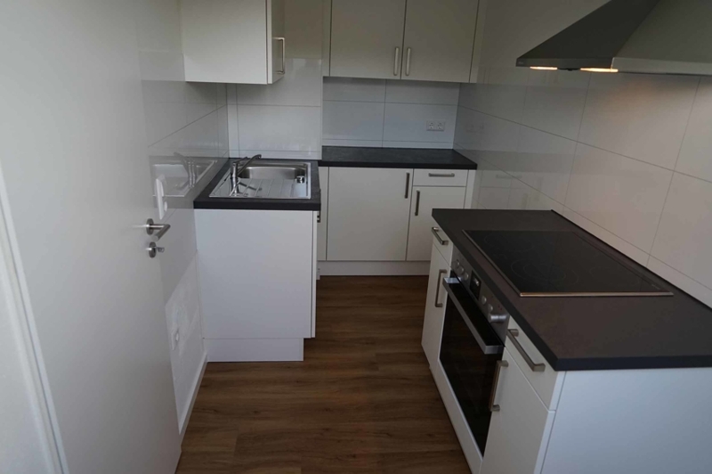 Die Küche ist mit einer neuen, weißen Einbauküche ausgestattet mit sämtlichen elektrischen Geräten wie Backofen, Cerankochfeld, Dunstabzugshaube und Kühlschrank mit Gefrierfach. Der Waschmaschinenanschluss ist ebenfalls in der Küche.