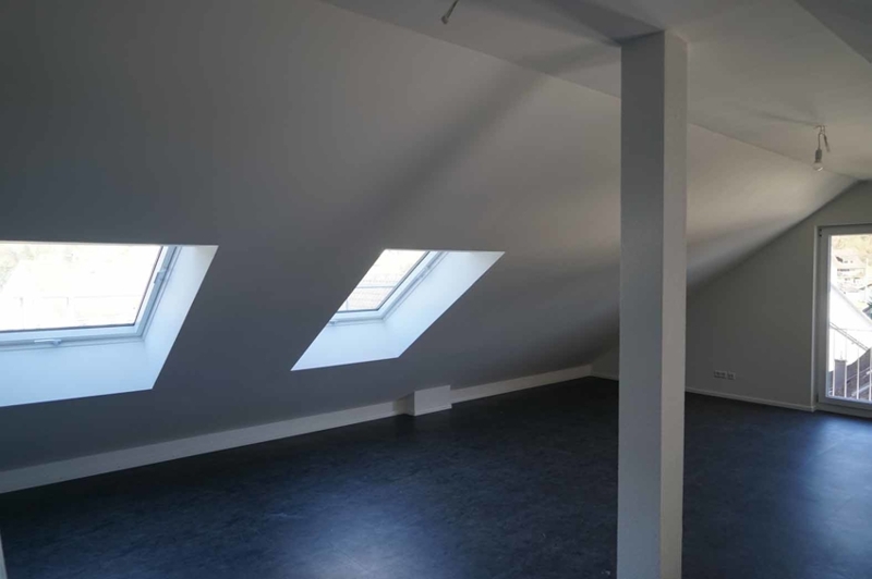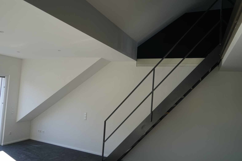 Die untere Wohnebene hat 3,5 Zimmern. An der rechten Innenwand des großen Wohnzimmers verläuft eine Treppe hoch zur über 55 m² großen Galerie, dem Highlight unserer Maisonettewohnung.
