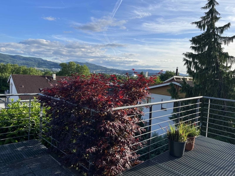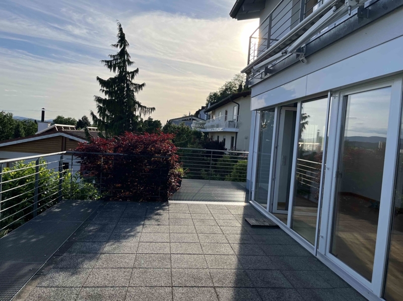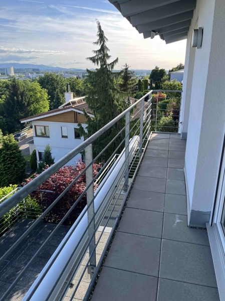 Mit Panoramablick bis in die Schweiz erstrahlt unser Einfamilienhaus (Doppelhaushälfte) am oberen Hang einer verkehrsberuhigten Wohngegend am Waldrand von Wyhlen. Eine längere Zugangstreppe führt seitlich an der Garage den Hang hinauf bis zum westlichen Hauseingang.