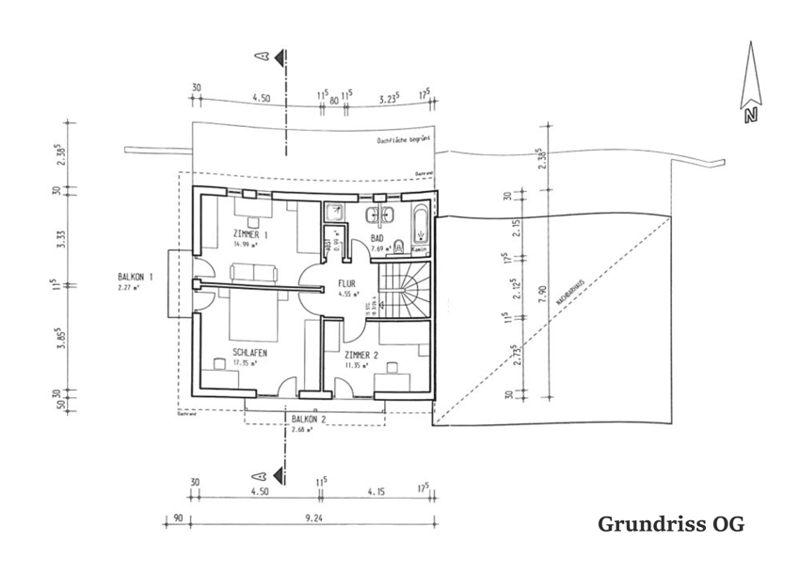 Das Obergeschoss bietet drei Schlafzimmer und ein Familienbad, dazu noch ein kleiner Abstellraum. Alle Schlafzimmer haben Zutritt zu mindestens einem der Balkone, die einmal südlich und einmal westlich ausgerichtet sind. In der vorstehenden Wohnfläche sind die Balkone sowie die Terrasse mit 1/4 Ihrer Größe bereits enthalten.