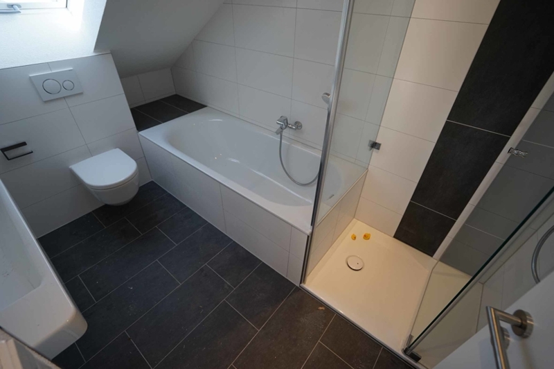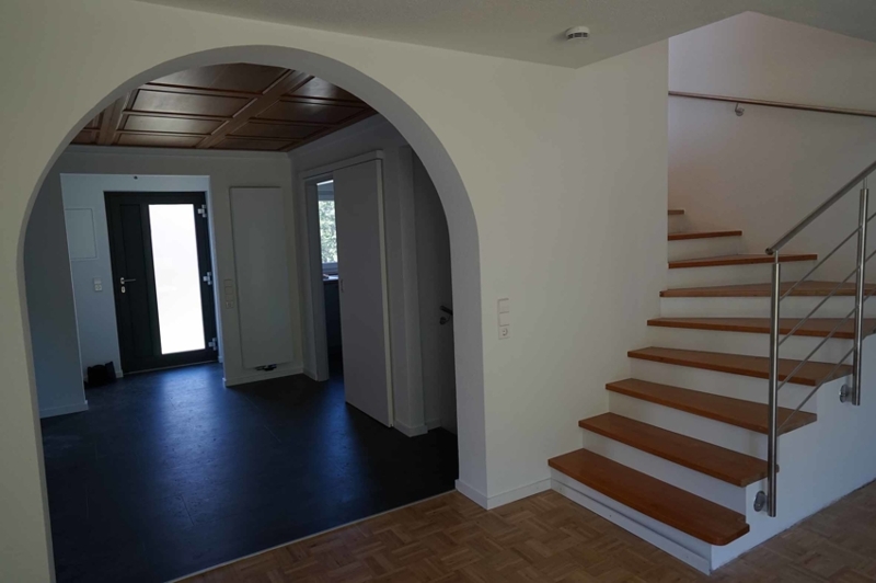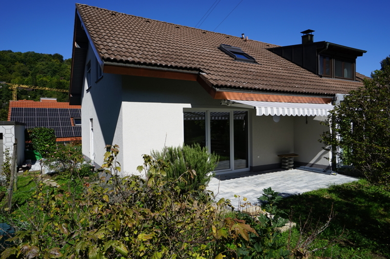 Das Wohnhaus wurde 1985 in Doppelhausform errichtet. Unsere süd/west ausgerichtete Haushälfte befindet sich im hinteren Grundstücksbereich und damit nicht an der Straße, wobei es sich bei der Straße auch nur um eine Stichstraße (Sackgasse) handelt. 2022 wurde das gesamte Haus saniert und erst vor kurzem bezugsfertig. Im einzelnen wurden folgende Maßnahmen durchgeführt: