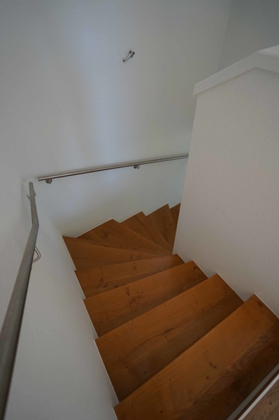 Der Hauseingang befindet sich auf der Nordseite des Wohnhauses. Eine breite Hauseingangstür führt direkt in die Diele. Gleich rechts im Grundriss eine Gästetoilette. Links im Grundriss die Küche daneben ein großes Esszimmer mit Holzkassettendecke und separaten Ausgang (Terrassentür) auf die im Westen angelegt Terrassenfläche. Ein sehr breiter Bogendurchgang führt in das danebenliegend Wohnzimmer mit besagtem Echtholz massiv Parkettboden. Das Wohnzimmer ist mit einer sehr breiten doppelflügligen Terrassentür nach Süden ausgestattet. Von hier gelang man in den kleinen aber feinen Garten im Süden. Eine modern gestaltete mit Holz belegteTreppe führt hinauf in das Dachgeschoss. Dort oben gibt es drei Zimmer, zwei größere Giebelzimmer und ein kleines Dachzimmer nach Süden. Dieses Zimmer ist mit einem hochwertigen von außen beschatteten Dachflächenfenster ausgestattet. Gegenüber den Zimmern befindet sich ein Badezimmer mit Dusche und Badewanne ausgestattet. Badezimmer und Gästetoilette sind modern mit dunklen und weißen großformatigen Fliesen ausgestattet. Im Flurbereich hier oben gibt es ein Zugang in den Speicherraum unter dem Dach.