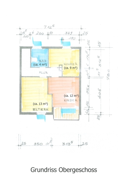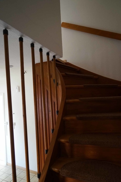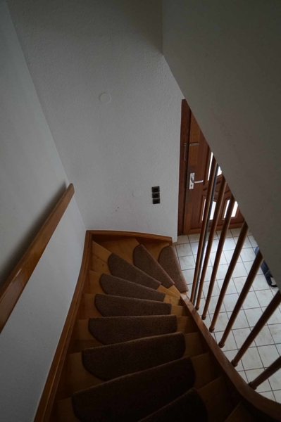 Das Gäste-WC befindet sich im Eingangsbereich/Flur. Von hier aus führt das Treppenhaus sowohl in den Keller und Heizraum als auch nach oben in die Schlafräume. Hier sind sowohl Elternschlafzimmer als auch zwei Kinderzimmer angesiedelt sowie das Badezimmer. Von einem der Schlafzimmer aus betreten wir den über der Terrasse liegenden Südbalkon.