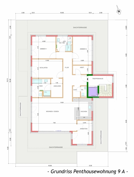 Das Penthouse mit ca. 205 m² Wohnfläche befindet sich im Dachgeschoss eines im Jahr 2019 errichteten Wohnhauses mit weiteren acht Wohnungen. In der genannten Wohnfläche ist die Gesamtfläche der Dachterrasse der Penthouse-Wohnung mit einem Viertel (ca. 44 m²) enthalten. Die rundum verlaufende Terrassenfläche ist von jedem Zimmer aus begehbar und lediglich durch den Aufbau des Treppenhauses und der Personenliftanlage unterbrochen. Unser Penthouse, die Tiefgaragenstellplätze und Kellerräume sind über einen Personenlift barrierefrei sowie über ein Treppenhaus erschlossen. Das Dachgeschoss hat ein nach Westen geöffnetes Pultdach. Die Raumhöhen der westlich ausgerichteten Zimmer betragen dort über drei Meter. Das Wohngebäude erfüllt aufgrund energiesparender baulicher und technischer Ausführungen in den Bereichen Heizung, Lüftung und Dämmung den KfW- Effizienzhaus-Standard (KfW 40). Im Detail ist das Wohnhaus mit einem Lüftungssystem mit integrierter Wärmerückgewinnung und einer die Heizungsanlage unterstützenden Wärmepumpe ausgestattet. Diese Kombination sorgt nicht nur für ein angenehmes Raumklima sondern trägt in hohem Maße zur Energieeffizienz bei. Im Ergebnis führt das energetische Gesamtpaket zu einem primären Energiebedarf von max. 40 % des Höchstwerts nach der Energieeinsparverordnung EnEV 2009. EnergieausweisWesentlicher Energieträger: GasKlasse: A+