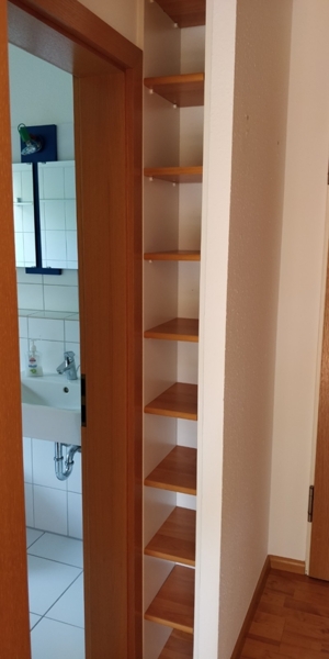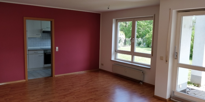 Schlafzimmer und Wohn-, Essbereich sind mit Laminat verlegt. Im Bad und in der Küche finden wir Fliesen vor. Die Wände sind mit weiß gestrichener Raufasertapete bestückt. Lediglich die Wand zur Essecke ist rot gestrichen, wie auf den Fotos ersichtlich.