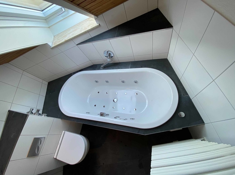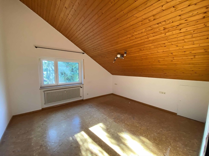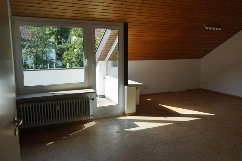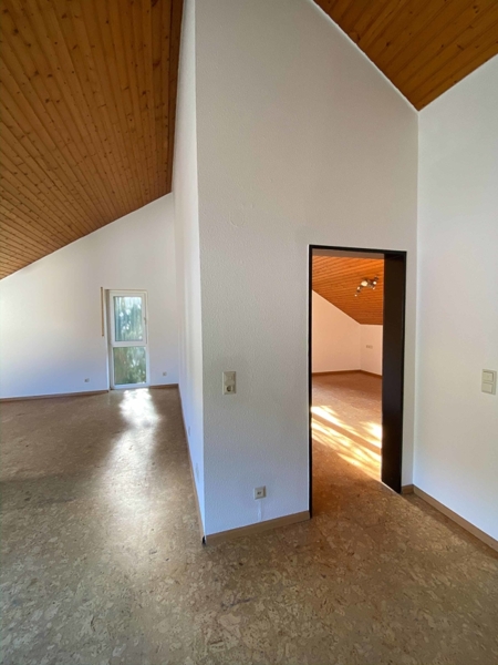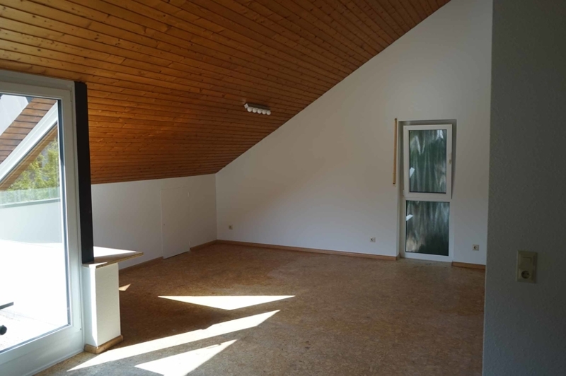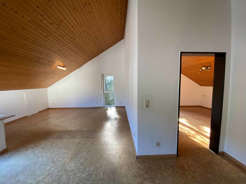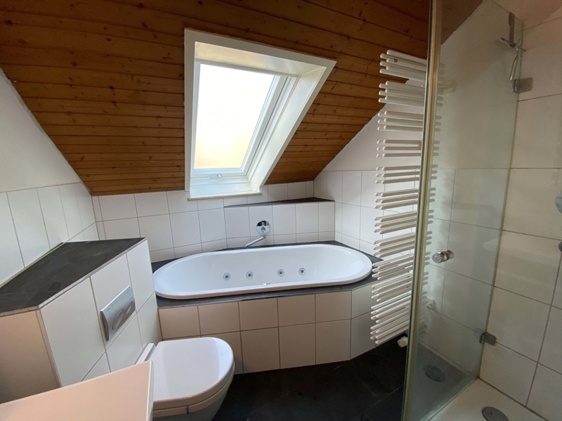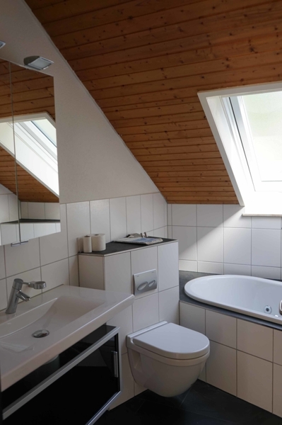 Die Wohnungseingangstür führt uns direkt in den offenen Wohn- und Essbereich. Gleich rechter Hand finden wir das außenliegende Badezimmer mit großem ROTO Dachflächenfenster in weißem Kunststoff mit Ornamentverglasung, welches im März 2020 eingebaut wurde. Das Badezimmer hat einen beinahe quadratischen Grundriss und bietet auf kleinem Raum durch die optimale Gestaltung alle Annehmlichkeiten des heutigen Lebens. Es gibt sowohl eine Dusche als auch eine Übereckbadewanne mit Luftdüsen (Whirlpool Feeling), dazu ein modernes Hänge-WC und Hängewaschtischunterschrank, ein Handtuchheizkörper … alles sehr stilvoll, praktisch und modern eingerichtet. Weiße, großflächige Wandfliesen - dazu im Kontrast anthrazitgraue Bodenfliesen. Kurzum: ein modernes Bad mit Wohlfühlcharakter. Der großzügige Wohn-, Essbereich mit beinahe 28 m² Wohnfläche besticht durch seine Deckenhöhe. Hier wurde auf das Abhängen der Decke auf die übliche Raumhöhe verzichtet und diese bis in den First hinein ausgebaut. Die höchste Stelle sowohl im Wohn- als auch im Schlafzimmer misst mehr als 4,00 m und wird durch den sichtbaren Deckenbalken optisch noch hervorgehoben.