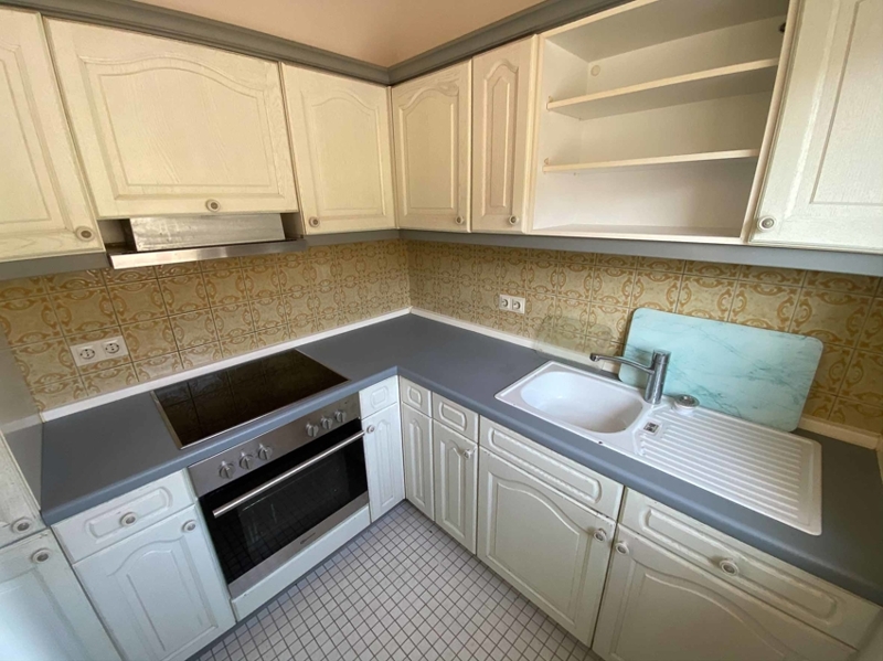 Der Kniestock ist auf den Außenseiten dieser beiden Räume knapp über 1,20 Meter hoch. Der dahinterliegende Bereich wurde teilweise ausgebaut und als Stauraum zugänglich gemacht. Die Küche ist klein aber fein, alles was man benötigt. Außerdem ein offener Durchgang zum Essbereich und ein großes Fenster zur Loggia hin.