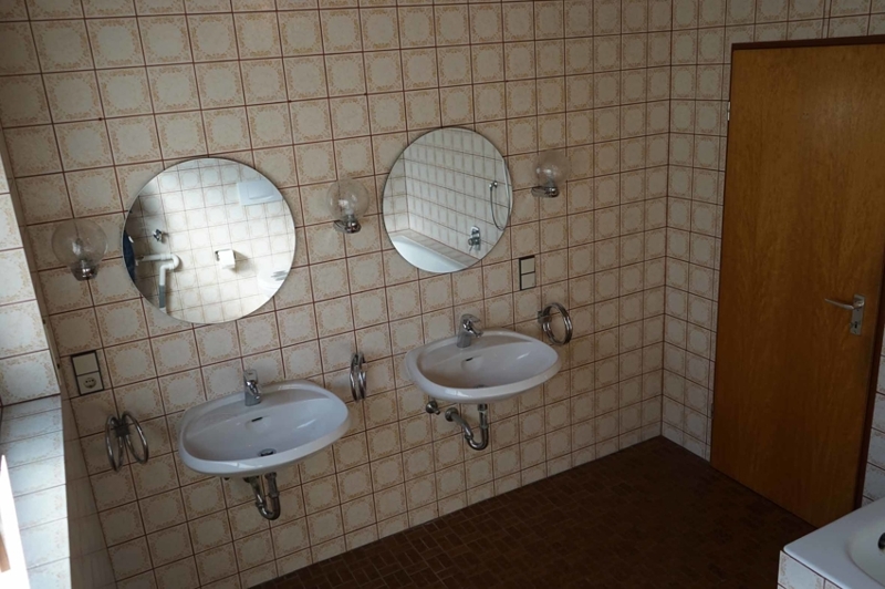 Von der Diele aus gelangen wir über einen Flur südseits zum Arbeitszimmer und dem innenliegenden kleineren Bad mit Dusche. Ein paar Schritte weiter finden wir die beiden Schlafzimmer und das außenliegende (fast 10 m²) große Bad mit Badewanne, zwei Waschbecken und genügend Platz für Waschmaschine und Schränke.