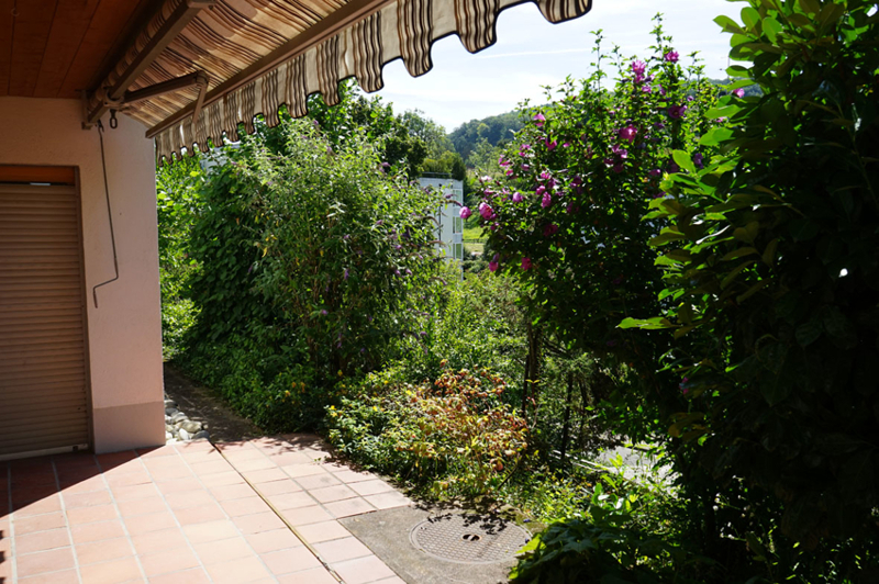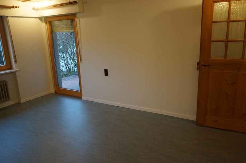 Vom Flur aus geht es links in den ca. 20 m² großen Wohnbereich. Dieser hat zum Garten hin eine Fensterfront und bietet über eine Balkontür Zugang zur Gartenterrasse. Die Terrasse ist zum größten Teil vom darüber liegenden Stockwerk überdacht und mit einer breiten Markise bestückt.