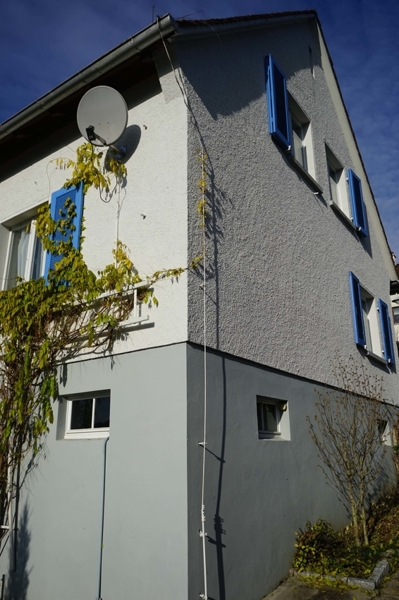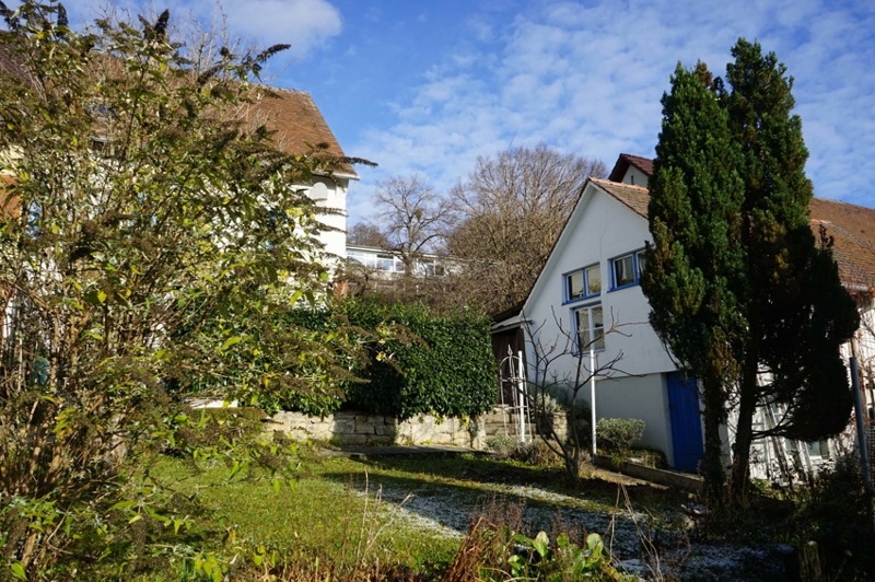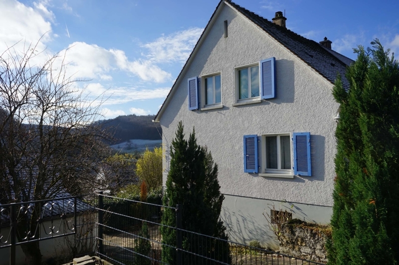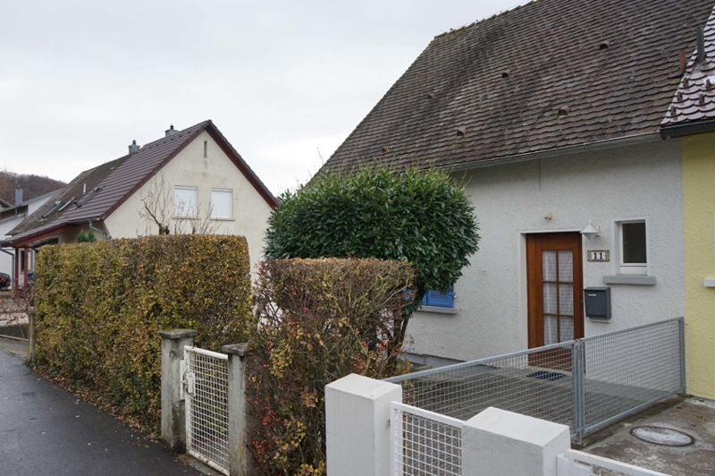Das Wohnhaus wurde im Jahr 1949 in massiver Bauweise auf einem Nord/Süd ausgerichtetem Grundstück mit einer Gesamtfläche von 429 m² in mittlerer Hanglage errichtet. Das Gebäude steht oben im Grundstück auf dem Niveau zur angrenzenden Straße. Vom Hauseingang auf der Nordseite gelangen Sie somit barrierefrei in das Erdgeschoss mit zwei Zimmern, Küche und Gäste-WC. Die Erschließung (der Hauseingangsbereich) ist großzügig. Hier wäre ausreichend Platz für Fahrräder und eine Müll Box. Neben dem Eingangsbereich (linke Seite) ist ein kleines Gärtchen angelegt, hier könnte mit wenig Aufwand ein Kfz- Stellplatz errichtet werden, ähnlich der Vorgabe in unmittelbarer Nachbarschaft. Der eigentliche Gartenbereich (über die Hälfte der Grundstücksfläche) liegt auf der Südseite unseres Grundstücks in leichter Hanglage. Dort befindet sich direkt vor dem Haus eine große Terrassenfläche. Dort steht auch unmittelbar auf der östlichen Grundstücksgrenze ein teilweise gemauertes, zweistöckiges Nebengebäude, welches aktuell für Gartengeräte und sonstige Lagerfläche genutzt wurde.