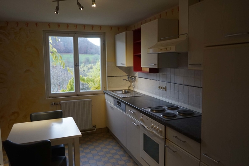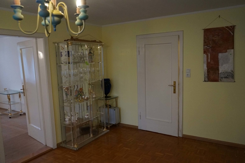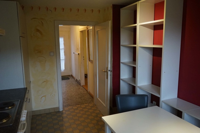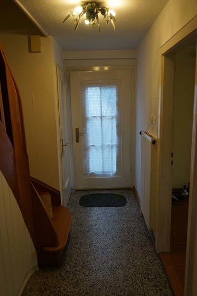 Im Flurbereich im EG liegt ein sehr schöner Terrazzofliesenboden aus dem Baujahr. Die Küche ist komplett gefliest. Im Wohnzimmer finden wir einen massiven Parkettboden vor. Das zweite Zimmer im Erdgeschoss und die beiden Schlafzimmer im Dachgeschoss sind mit einem Teppichbelag ausgestattet. Die Küche bietet für zwei Personen an einem Tisch ausreichend Platz. Hier bestünde aber auch die Möglichkeit zusammen mit dem danebenliegenden Zimmer einen großen Wohn- Essbereich zu schaffen. Die Wände sind überwiegend mit Raufaser versehen.