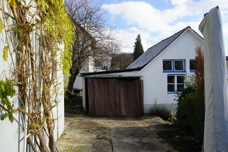 Neben dem Wohnhaus an der östlichen Grundstücksgrenze führt eine breite Betonrampe hinunter zum Terrassenbereich und vor das Nebengebäude. Früher hat man bei diesen Häusern wegen der Hanglage aus Kostengründen derartig steile Abfahrten gebaut um im unteren, flachen Grundstücksteil zu parkieren bzw. sein Gefährt unterzustellen. Im Bereich der Rampenfläche wäre ausreichend Platz für den Neubau einer Garage/ eines Carports oder den Einbau eines KFz- Stellplatzes.