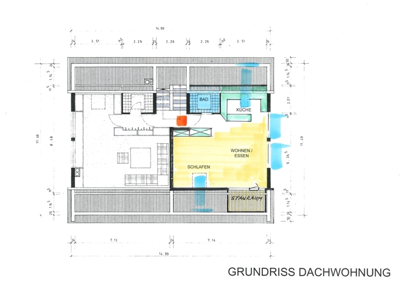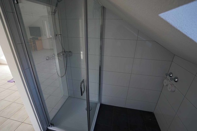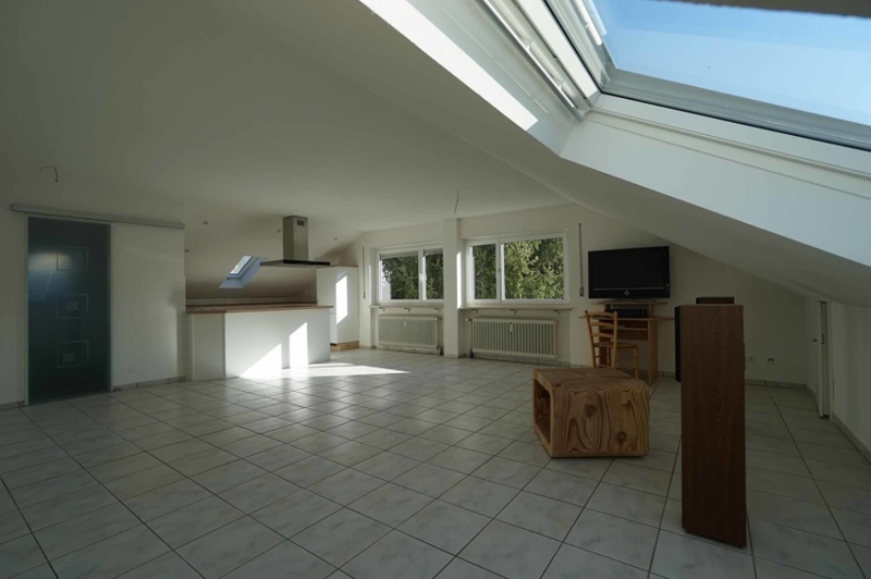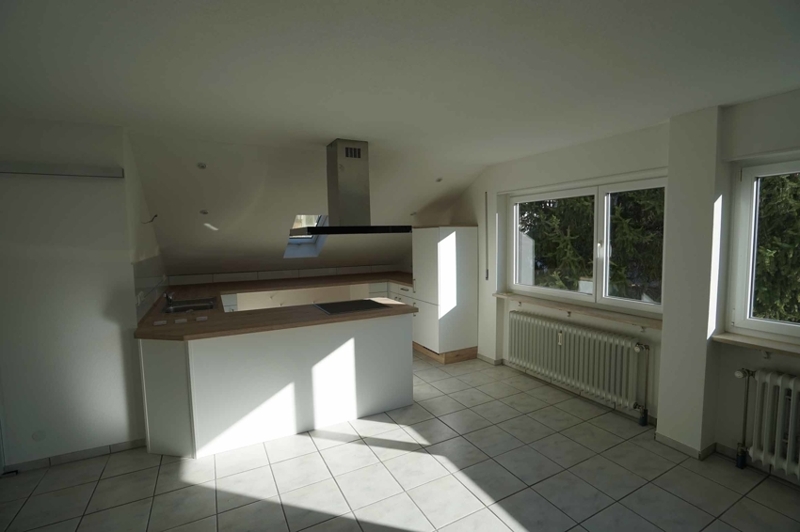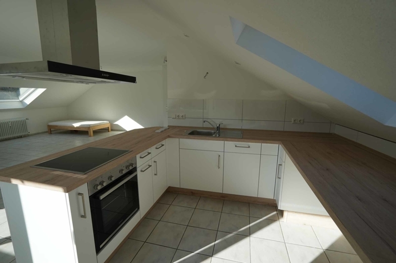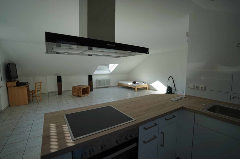 Die Wohnung besteht aus einem großen Wohn-/Schlafbereich mit einer anschließenden, offenen Küche und einem Badezimmer mit Dusche. Die Bodenfläche der Wohnung beträgt gute 60 m² und der Kniestock liegt bei knapp 1 m. Durch Abzug der Schrägen kommen wir so auf eine offizielle Wohnfläche von ca. 46 m².