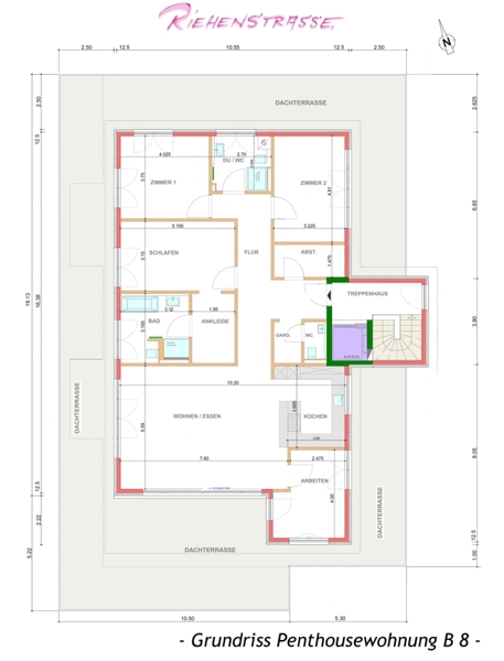Das Penthouse mit ca. 205 m² Wohnfläche befindet sich im Dachgeschoss eines im Jahr 2019 errichteten Wohnhauses mit weiteren sieben Wohnungen. In der genannten Wohnfläche ist die Gesamtfläche der Dachterrasse der Penthouse-Wohnung mit einem Viertel (ca. 44 m²) enthalten. Die rundum verlaufende Terrassenfläche ist von jedem Zimmer aus begehbar und lediglich durch den Aufbau des Treppenhauses und der Personenliftanlage unterbrochen.