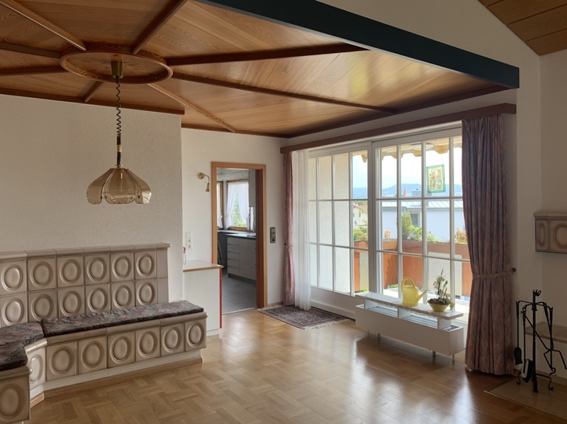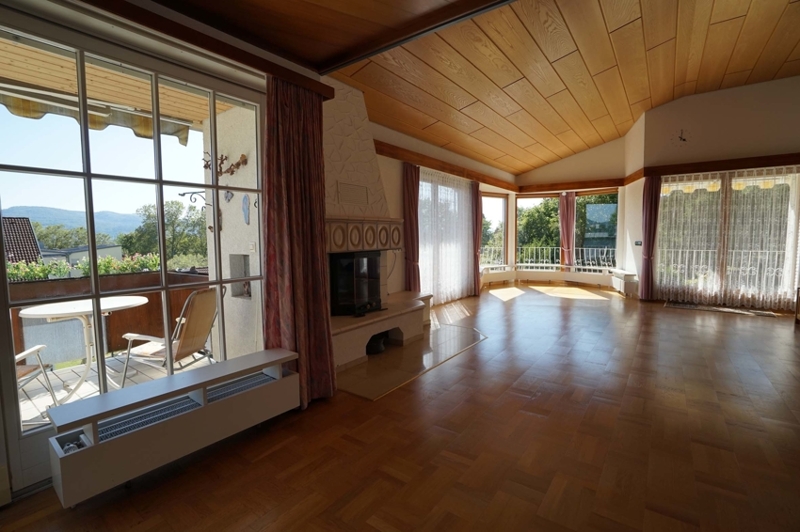 Vom Eingangsbereich gelangen wir geradeaus direkt ins Herzstück unserer Wohnung. Der großzügige Wohn- und Essbereich umfasst beinahe 50 m². Durch die bodentiefen Fensterelemente und die Westausrichtung ist dieser Raum sehr hell. Zutritt haben wir von hier aus auf die Westterrasse und den nordwestlich umlaufenden Balkon, der mit einem sehr ansprechenden, geschwungenen, weißen Stahlgeländer versehen einen kreisrunden Erker im Wohnzimmer umrahmt. Ein Kamin und ein Kachelofen, beide mit Sitzbank, sorgen im Winter für Wärme und Gemütlichkeit.