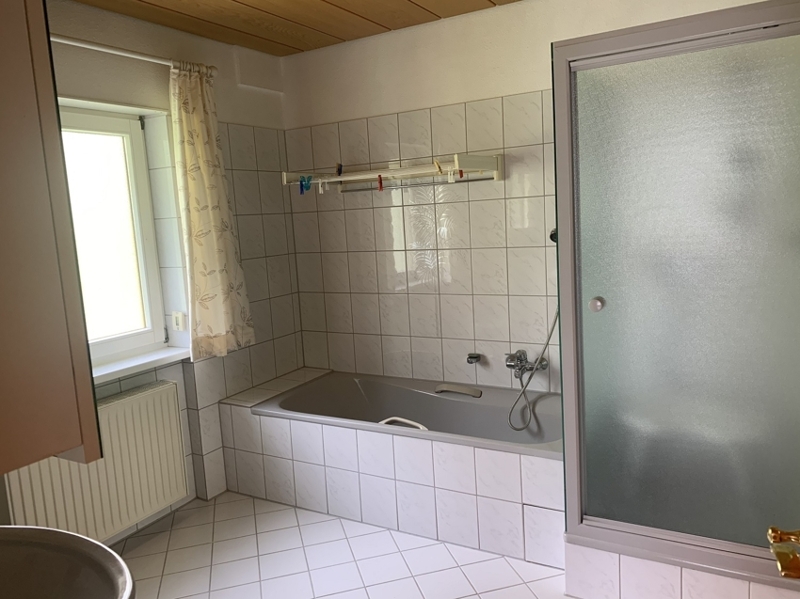 Das außenliegende Badezimmer mit hellgrauen Fliesen ist mit knapp 8 m² und quadratischem Grundriss ausreichend geräumig. Es umfasst sowohl eine Badewanne als auch eine Dusche. Das Badezimmer kann sowohl vom Schlafzimmer als auch vom Flurbereich betreten werden.