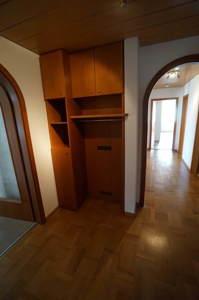 Im Schlafzimmer wurden hochwertige Einbauschränke eingepasst, zeitlos mit glatten, weißen Fronten. Im Wohnzimmer befindet sich ein Regalelement in zum Boden passender Holzoptik.