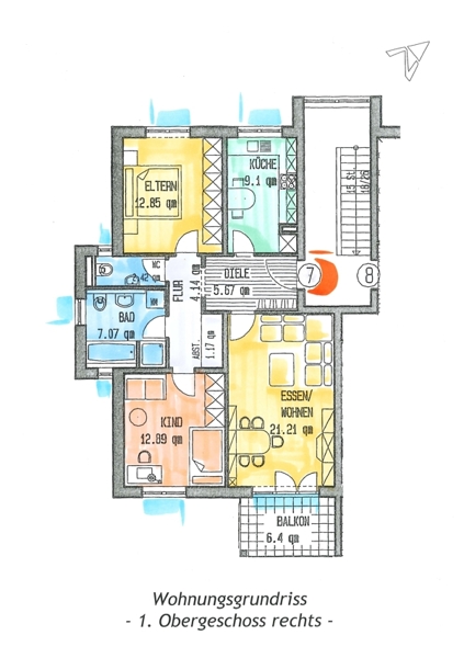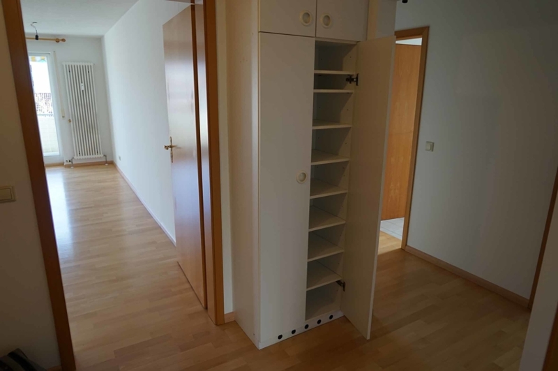 Unsere Wohnung ist nach drei Seiten hin außenliegend, somit sehr hell. Südlich bzw. südöstlich gelegen das Wohnzimmer mit Balkon und eines der Schlafräume. Südwestlich sind das außenliegende Badezimmer und das Gäste-WC angeordnet. Nach Nordwesten hin das zweite Schlafzimmer sowie die Küche. Im Eingangsbereich sind ein Schuh- sowie ein Einbauschrank vorhanden.