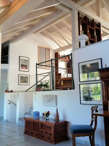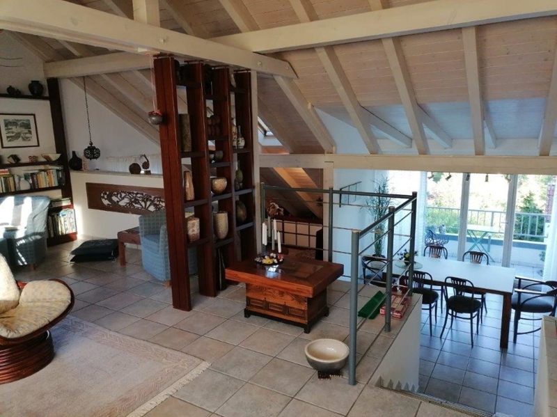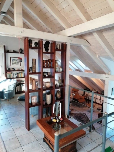 Dieser Eindruck setzt sich im Inneren des Hauses fort. Die Wohnung ist modern und hochwertig ausgestattet. Die helle, sehr offene Raumgestaltung ist das Ergebnis einer außergewöhnlichen Dacharchitektur. In sämtlichen Wohnräumen liegt heller, marmorierter Fliesenboden mit Fußbodenheizung. Das Bad ist ebenfalls modern eingerichtet mit Hängeschränken und raumhoch gefliest. Eine begehbare Dusche im großen Badezimmer und ein ansprechendes Lichtkonzept vervollständigen den guten Eindruck.