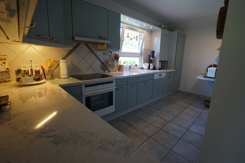 Die hochwertige Einbauküche in L-Form ist zweckmäßig ausgestattet und hat einen direkten Zugang in einen relativ großen Vorratsraum.