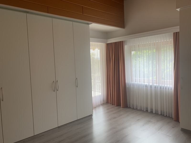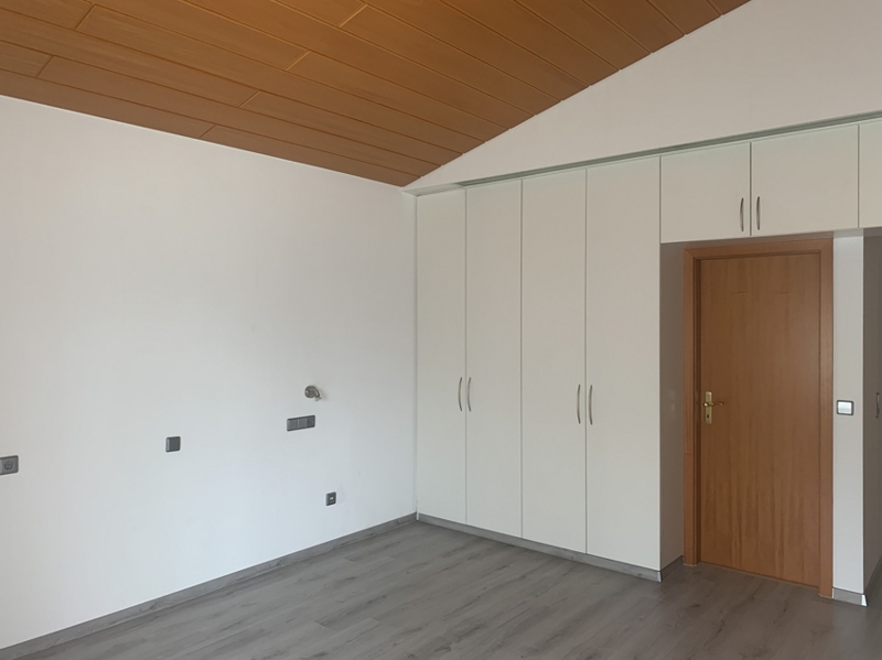 Im Schlafzimmer wurden hochwertige Einbauschränke eingepasst, zeitlos mit glatten, weißen Fronten. Im Wohnzimmer befindet sich ein Regalelement in zum Boden passender Holzoptik.